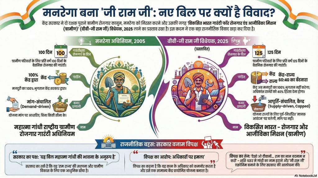इस नए VB-G RAM G बिल में ग्रामीण परिवारों के लिए रोजगार गारंटी को 100 दिनों से बढ़ाकर 125 दिन करने का प्रस्ताव है। हालांकि, विपक्ष और थरूर ने इस बात पर चिंता जताई है कि इसमें राज्यों पर वित्तीय बोझ (40% खर्च) डाला जा रहा है, जो राजकोषीय संघवाद (Fiscal Federalism) का उल्लंघन है और गरीब राज्यों के लिए योजना को लागू करना मुश्किल बना देगा,।