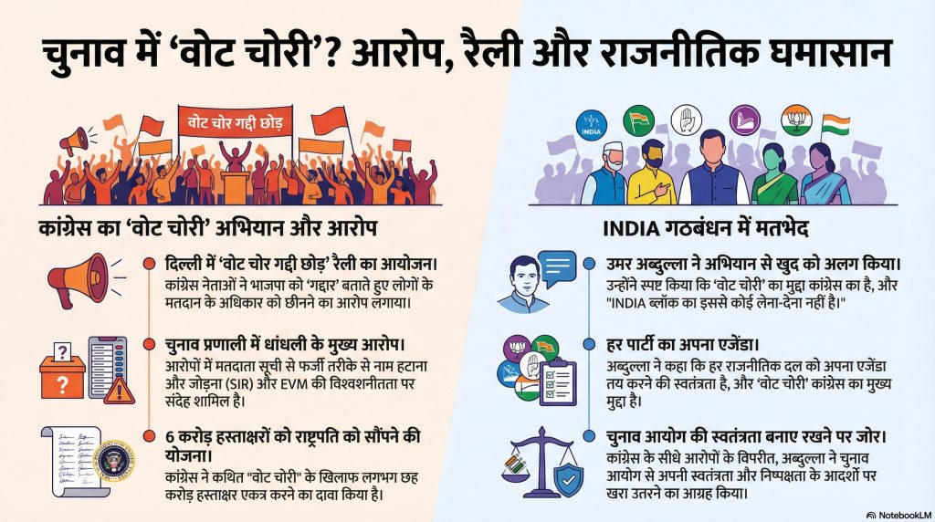 हालांकि कांग्रेस इस मुद्दे पर आक्रामक है, लेकिन ‘INDIA’ गठबंधन के कुछ सहयोगी इस अभियान से दूरी बनाते दिख रहे हैं। जम्मू-कश्मीर के मुख्यमंत्री उमर अब्दुल्ला ने स्पष्ट किया कि “वोट चोरी” कांग्रेस का मुद्दा है और “INDIA ब्लॉक का इससे कोई लेना-देना नहीं है।” उन्होंने कहा कि हर पार्टी अपना एजेंडा तय करने के लिए स्वतंत्र है।