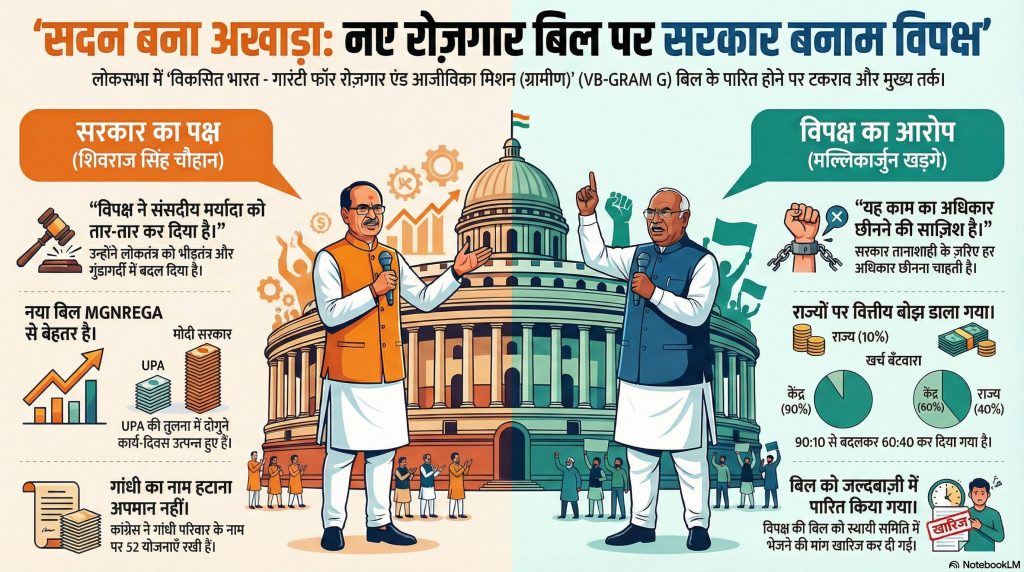 भारतीय संसद, जिसे हम ‘लोकतंत्र का मंदिर’ कहते हैं, पिछले गुरुवार को एक युद्ध के मैदान में तब्दील हो गई। यह दृश्य किसी सभ्य बहस का नहीं, बल्कि एक सियासी ‘दंगल’ का था जहाँ कागज़ फाड़े गए, नारे गूंजे और अंततः एक ऐतिहासिक कानून—महात्मा गांधी राष्ट्रीय ग्रामीण रोजगार गारंटी अधिनियम (MGNREGA)—को इतिहास के पन्नों में दफन कर दिया गया। मोदी सरकार ने विपक्ष के भारी विरोध और हंगामे के बीच ध्वनि मत (voice vote) से ‘विकसित भारत गारंटी फॉर रोजगार एंड आजीविका मिशन (ग्रामीण)’ यानी VB-G RAM G Bill को लोकसभा में पास करा लिया,। लेकिन सवाल यह है कि क्या यह सिर्फ एक बिल का पास होना था, या संसदीय मर्यादाओं का “चीरहरण”?