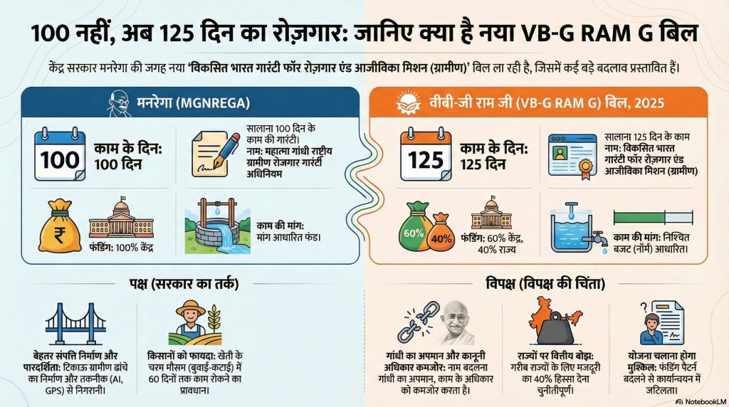 निष्कर्ष संक्षेप में, VB-G RAM G बिल ग्रामीण मजदूरों को 25 दिन अतिरिक्त रोजगार का वादा तो करता है, लेकिन साथ ही यह राज्यों पर वित्तीय जिम्मेदारी डालता है और खेती के सीजन में सरकारी काम रोकने का प्रावधान लाता है। सरकार इसे आधुनिकीकरण और विकास बता रही है, जबकि विपक्ष इसे गरीबों के अधिकारों और राज्यों के संसाधनों पर हमला मानता है I