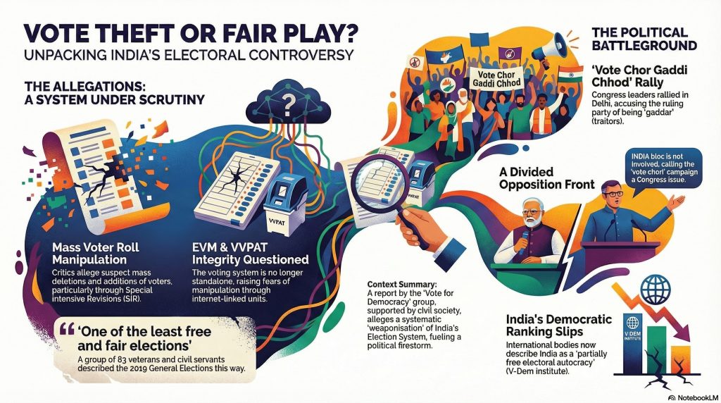 The rally drew heavily on data compiled by civil society groups, such as Vote for Democracy (VFD), which highlights alleged irregularities in the recent Maharashtra and Haryana assembly elections. The Opposition flagged a “Midnight Mystery” in Maharashtra, where voter turnout reportedly jumped by 7.83% after polling officially closed at 5:00 PM—a surge involving approximately 65 lakh votes,.